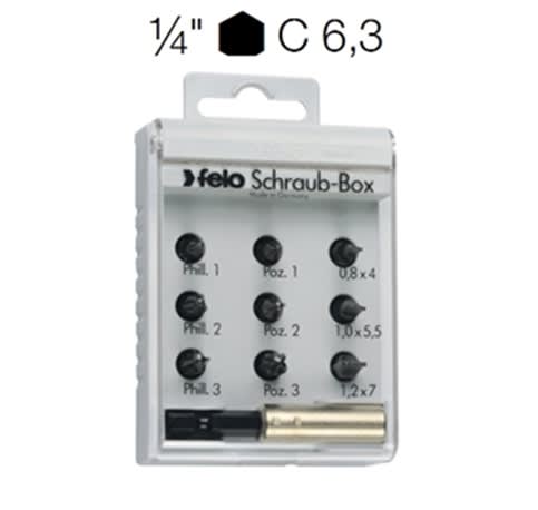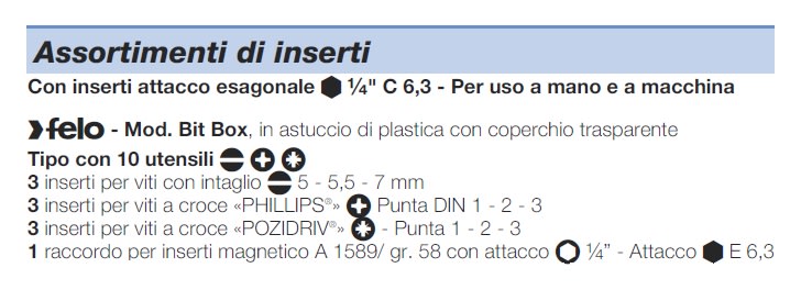 Set di inserti, astuccio di plastica con coperchio trasparente con 10 utensili: •3 inserti per viti con intaglio 5 - 5,5 - 7 mm •3 inserti per viti a croce «PHILLIPS» Punta DIN 1 - 2 - 3 •3 inserti per viti a croce «POZIDRIV» - Punta 1 - 2 - 3 •1 raccordo per inserti magnetico A 1589/ gr. 58 con attacco esagonale 1/4" - Attacco E 6,3