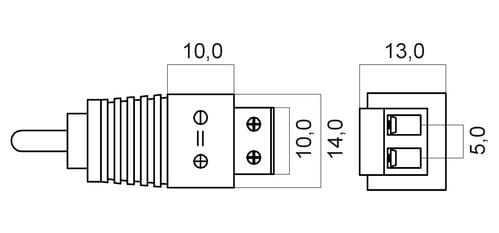 ** Caratteristiche Generali ** Genere: Spina Orientamento: Dritto Tipo Connettore A: RCA Genere A: Spina Tipo Connettore A: Spina RCA Tipo Connettore B: Morsetto a vite Tipo Connettore B: Morsetto a vite 2 poli ** Caratteristiche Elettriche ** Schermatura: si ** Caratteristiche Meccaniche ** Materiale Corpo: PVC Materiale Contatto: Ottone nichelato Lunghezza Cavetto: 2cm