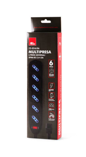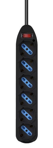 ** Caratteristiche Generali ** Colore: Nero Tipo di prese: Universale Italia P40 Numero di prese Universali: 6 Numero di Prese Totali: 6 Tipo di spina: Diritta ** Caratteristiche Meccaniche ** Materiale corpo: Termoplastico rinforzato Materiale contatti: Lega di rame Cavo Alimentazione: H05VV-F 3G1 3x1,0mm² Lunghezza cavo complessiva: 1.5m Colore cavo: Nero Accensione: Con interruttore luminoso Sistemi sicurezza: Alveoli protetti da contatti accidentali, Prese con protezione bimbi Protezioni: Messa a terra per ogni presa, Sovraccarico
