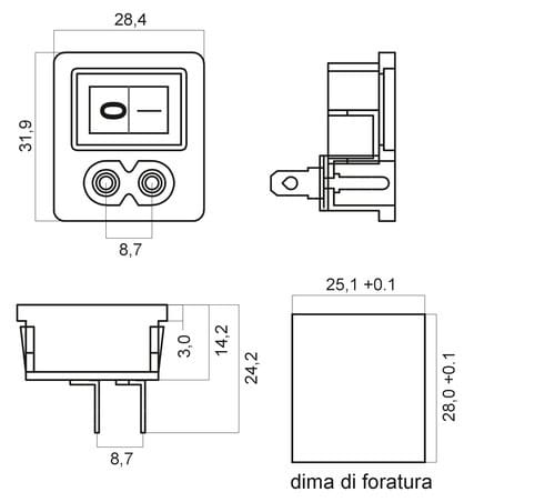 ** Caratteristiche Generali ** Genere: Spina Norma di riferimento: EN 60320 Foglio tecnico: C8 ** Caratteristiche Elettriche ** Corrente max: 2.5A Tensione max: 250V ** Caratteristiche Meccaniche ** Materiale Corpo: Termoplastico rinforzato con fibra di vetro Materiale Contatto: Lega di rame Tipo contatto: faston 4.8mm Montaggio connettore: pannello ** Caratteristiche Termiche ** Temperatura di lavoro: 0/70°C