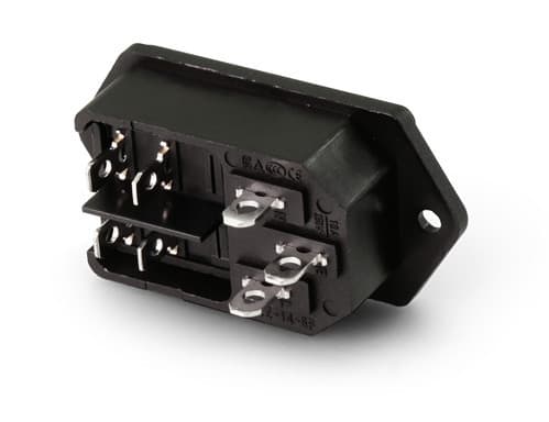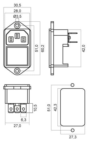 ** Caratteristiche Generali ** Genere: Spina Norma di riferimento: EN 60320 Foglio tecnico: C14 ** Caratteristiche Elettriche ** Corrente max: 10A Tensione max: 250V ** Caratteristiche Meccaniche ** Formato Fusibile: 5x20mm Materiale Corpo: Termoplastico rinforzato con fibra di vetro Materiale Contatto: Lega di rame Tipo contatto: faston 4.8mm Montaggio connettore: pannello Foro fissaggio: 27.3mm x 42.3mm ** Caratteristiche Termiche ** Temperatura di lavoro: 0/70°C