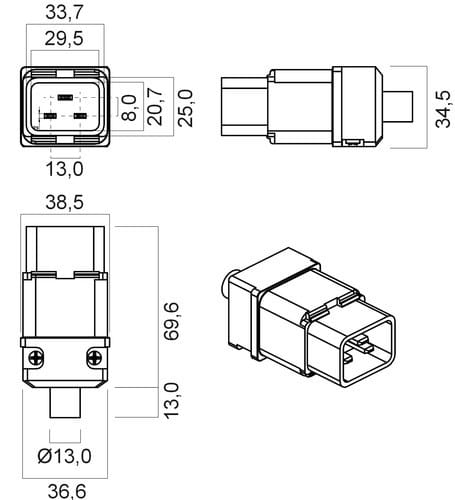 ** Caratteristiche Generali ** Genere: Spina Foglio tecnico: C20 Colore: Nero Orientamento: Dritto ** Caratteristiche Elettriche ** Corrente max: 16A Tensione max: 250V ** Caratteristiche Meccaniche ** Materiale Corpo: ABS Materiale Contatto: Nickel Montaggio connettore: volante ** Caratteristiche Termiche ** Temperatura di lavoro: -40/70°C
