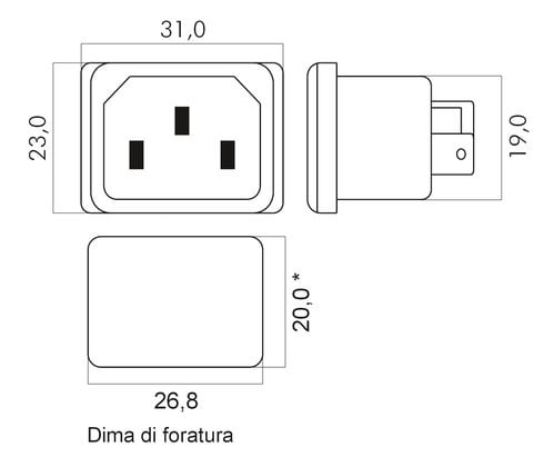 ** Caratteristiche Generali ** Genere: Spina Norma di riferimento: EN 60320 Foglio tecnico: C14 Colore: Nero ** Caratteristiche Elettriche ** Corrente max: 10A Tensione max: 250V ** Caratteristiche Meccaniche ** Materiale Corpo: Termoplastico rinforzato con fibra di vetro Materiale Contatto: Lega di rame Tipo contatto: faston 6.3mm Montaggio connettore: pannello Foro fissaggio: 26.8mm x 20mm ** Caratteristiche Termiche ** Temperatura di lavoro: 0/70°C
