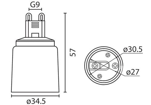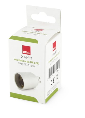 ** Caratteristiche Generali ** Attacco A: Maschio G9 Attacco B: Femmina E27 ** Caratteristiche Elettriche ** Tensione max: 240V Corrente max: 2A ** Caratteristiche Meccaniche ** Materiale corpo: Plastico ** Caratteristiche Termiche ** Temp. di funzionamento: 0 / 35°C