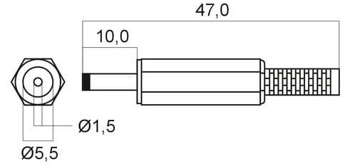 ** Caratteristiche Generali ** Genere: Spina Colore: Nero Orientamento: Dritto ** Caratteristiche Meccaniche ** Materiale Corpo: PVC Materiale Contatto: Ottone nichelato Tipo contatto: a saldare Montaggio connettore: volante Diametro Esterno: 5.5mm Diametro Interno: 1.5mm Lunghezza Contatto: 10mm