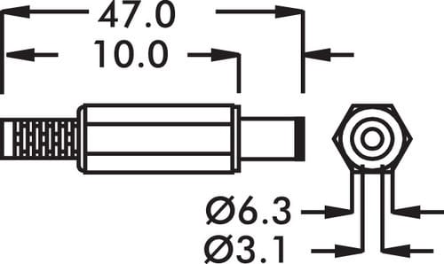 ** Caratteristiche Generali ** Genere: Spina Colore: Nero Orientamento: Dritto ** Caratteristiche Meccaniche ** Materiale Corpo: PVC Materiale Contatto: Ottone nichelato Tipo contatto: a saldare Montaggio connettore: volante Diametro Esterno: 6.3mm Diametro Interno: 3.1mm Lunghezza Contatto: 10mm