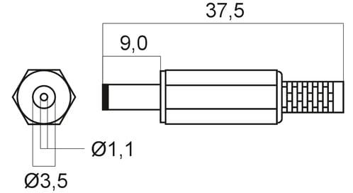 ** Caratteristiche Generali ** Genere: Spina Colore: Nero Orientamento: Dritto ** Caratteristiche Meccaniche ** Materiale Corpo: PVC Materiale Contatto: Ottone nichelato Tipo contatto: a saldare Montaggio connettore: volante Diametro Esterno: 3.5mm Diametro Interno: 1.1mm Lunghezza Contatto: 9mm