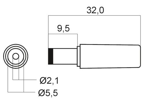 ** Caratteristiche Generali ** Genere: Spina Colore: Nero Orientamento: Dritto ** Caratteristiche Meccaniche ** Materiale Corpo: Bachelite Materiale Contatto: Ottone nichelato Tipo contatto: a saldare Diametro Esterno: 5.5mm Diametro Interno: 2.1mm Lunghezza Contatto: 9.5mm