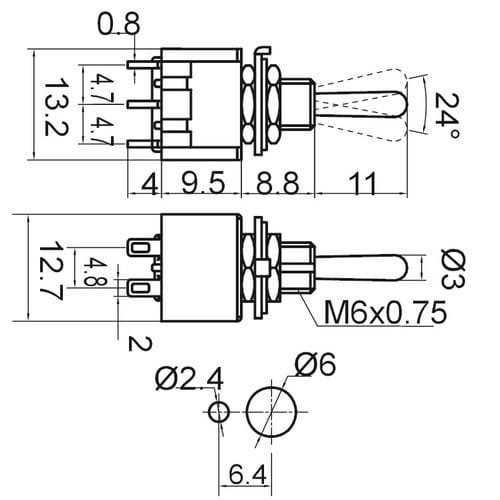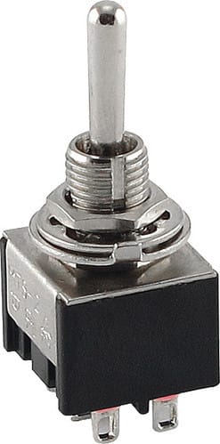 ** Caratteristiche Generali ** Attuatore: Levetta Serie: Miniatura Serigrafia: Nessuna Luminoso: no Materiale attuatore: Ottone nichelato Tipi contatti: DPCO Portata: 3A@250Vac, 6A@125Vac N. poli: 2 Stato dei contatti: (ON)/OFF/ON Tipo terminale: a saldare N. terminali: 6 Montaggio: Pannello con dado Foro fissaggio: ø6mm