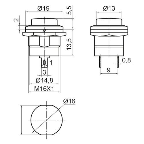 ** Caratteristiche Generali ** Attuatore: Pulsante Serigrafia: Nessuna Luminoso: no Colore: Nero Materiale attuatore: Plastica Tipi contatti: SPST Portata: 2A@250Vac, 4A@125Vac N. poli: 1 Stato dei contatti: OFF/(ON) - N.A. Tipo terminale: a saldare N. terminali: 2 Montaggio: Pannello con dado Foro fissaggio: ø16mm