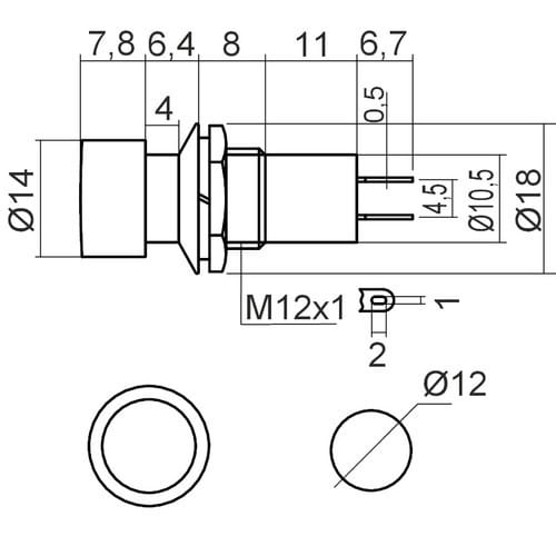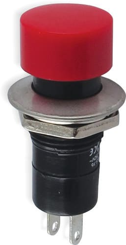 ** Caratteristiche Generali ** Attuatore: Pulsante Serigrafia: Nessuna Luminoso: no Colore: Rosso Materiale attuatore: Plastica Tipi contatti: SPST Portata: 1A@250Vac, 3A@125Vac N. poli: 1 Stato dei contatti: OFF/(ON) - N.A. Tipo terminale: a saldare N. terminali: 2 Montaggio: Pannello con dado Foro fissaggio: ø12mm
