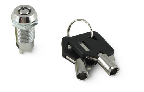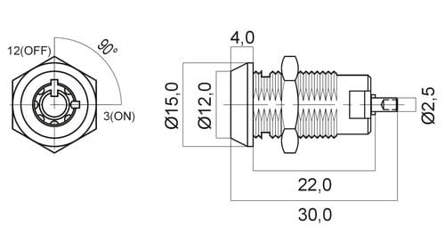 ** Caratteristiche Generali ** Attuatore: Chiave Forma dell'attuatore: Piatto, Rotondo Serigrafia: Nessuna Luminoso: no Materiale attuatore: Ottone nichelato Tipi contatti: SPST N. poli: 1 Stato dei contatti: ON/OFF Tipo terminale: a saldare N. terminali: 2 Montaggio: Pannello con dado Foro fissaggio: ø12mm Dieci diverse combinazioni Chiavi di ricambio non gestite