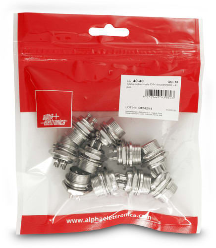 ** Caratteristiche Generali ** Genere: Spina Tipo Connettore: DIN Nr. Poli: 4 Adatto per: 40-10/40-11 ** Caratteristiche Meccaniche ** Materiale Corpo: Ottone nichelato Materiale Isolamento: Resina fenolica Tipo contatto: a saldare Montaggio connettore:pannello