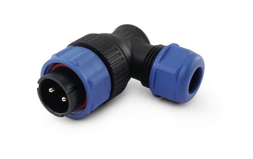 ** Caratteristiche Generali ** Genere: Spina Orientamento: 90° Nr. Poli: 2 Serie Fornitore: SP21 ** Caratteristiche Elettriche ** Corrente max: 30A Tensione max: 500V ** Caratteristiche Meccaniche ** Materiale Corpo: Nylon Materiale Contatto: Lega di rame dorata Tipo contatto: a saldare Montaggio connettore: volante Sezione conduttori: 0-4mm² Diametro cavo min: 4.5mm Diametro cavo max: 7mm Grado di protezione: IP68 ** Caratteristiche Termiche ** Temperatura di lavoro: -25/80°C