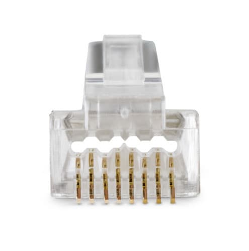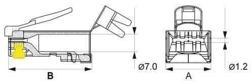 Connettore senza pettine interno Connettore con clip per schermatura Attenzione: necessario rimuove dalla pinza 98-155 il pin di terminazione ** Caratteristiche Generali ** Genere: Spina Categoria: CAT.6A Colore: Trasparente Nr. Poli: 8 Configurazione Poli: 8P8C Adatto per tipo conduttore: Trefolo + Rigido Sezione AWG: AWG23 Tipo Clip: Standard ** Caratteristiche Elettriche ** Schermatura: si ** Caratteristiche Meccaniche ** Materiale Corpo: PC UL 94V-2 Materiale Contatto: Bronzo fosforoso Placcatura contatti: Contatti dorati Tipo contatto: 3-prong Diametro conduttori max: 1.2mm Diametro cavo max: 6.8mm Inserti: 0 Placcatura: 50µm Formato Corpo: Standard Dim. A: 11.68mm Dim. B: 21.48mm ** Caratteristiche Termiche ** Classe di infiammabilità: UL94V-2