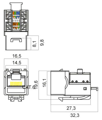 ** Caratteristiche Generali ** Genere: Presa Tipo Connettore: RJ45 Categoria: CAT.6 Colore: Avorio Nr. Poli: 8 Configurazione Poli: 8P8C ** Caratteristiche Elettriche ** Schermatura: no ** Caratteristiche Meccaniche ** Materiale Corpo: Plastico Terminazione: a pressione Tipo Keystone: EU 20.0mm ** NOTA ** Utilizzare l'apposito strumento (96-204/1) per completare l'operazione di inserimento dei terminali.