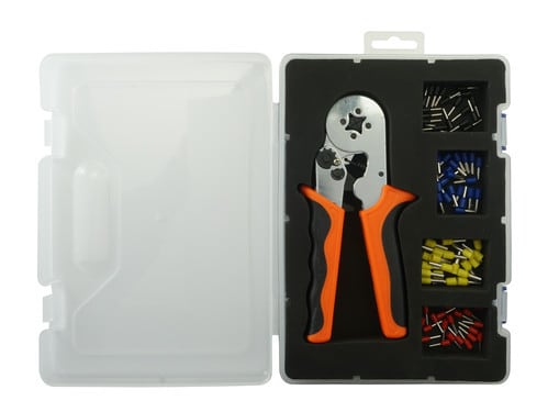 Inserimento laterale del terminale a bussola. Aggraffatura a sezione quadrata. ** Caratteristiche Generali ** Funzione: Crimpatura Adatta per connettori: Puntali Adatta per sezione cavo: 0.25-10mm² Adatta per terminali: AWG 10, AWG 11, AWG 12, AWG 13, AWG 14, AWG 15, AWG 16, AWG 17, AWG 18, AWG 19, AWG 20, AWG 21, AWG 22, AWG 23 Chiusura: a cricchetto Inserto: fisso Materiale corpo: Acciaio Materiale impugnatura: PVC Forma impugnatura: Antiscivolo ed ergonomica