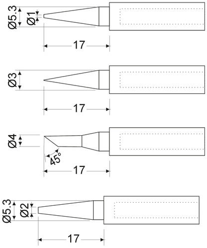Kit punte intercambiabili per stazione 98-226 - Punta conica Ø0,5mm - Punta ultrasottile - Punta a Scalpello 45° Ø3mm - Punta piatto Ø2mm ** Caratteristiche Generali ** Stile punta: Taglio, Conica