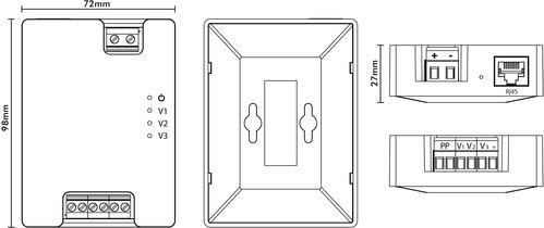 ** Caratteristiche generali ** Dimmer monocolore per strisce led e sorgenti led resistive a tensione costante 12V oppure 24V. Il controllo dell’intensità luminosa viene eseguito tramite pulsante generico opportunamente installato ai morsetti PP. Pulsantenon fornito. Il dispositivo mantiene memoria dell'ultimo modo di funzionamento impostato anche dopo aver spento e riacceso l'alimentazione. ** Tipologia controllo ** Comando: pulsante N.O. Modalità di controllo pulsante PP Click: acceso/spento Pressionea lungo da acceso: aumento/diminuzione intensità. Pressione a lungo da spento: accensione modalità “luce di cortesia” (10%). Attenzione questa intensità non è modificabile. Luminosità minima: 10% ** Protezioni ** Sovratemperatura, inversione di polarità sovraccarico Cortocircuito in uscita Sovra-alimentazione Sotto-alimentazione ** Caratteristiche Generali ** Funzione: Controller Adatto per: Monocolore Metodo di controllo: Pulsante ** Caratteristiche Elettriche ** Tipo regolazione: Tensione costante (CV) Tensione d'ingresso: 12/24V Tensione d'uscita: come ingresso Tipo di uscita: morsetti Metodo di connessione: anodo comune Corrente/Ch: 3A n. canali: 3 Potenza nominale (12V): 108W Potenza nominale (24V): 216W ** Caratteristiche Meccaniche ** Lunghezza: 98mm Larghezza: 72mm Altezza: 27mm Grado di protezione: IP20 Materiale corpo: Plastica Colore corpo: Bianco ** Caratteristiche Termiche ** Temp. di funzionamento: -10 / 40°C ** Attenzione ** Connettore RJ45 non connesso ** Note ** L’installazione deve essere eseguita solamente da personale qualificato. Il prodotto deve essere installato all’interno di un quadro elettrico. Installare un fusibile adeguato in ingresso al dispositivo. L’alimentatore dovrà essere scelto in funzione del carico led collegato per tensione e corrente. Utilizzare un alimentatore con potenza nominale maggiore rispetto al carico da alimentare (circa 30%).