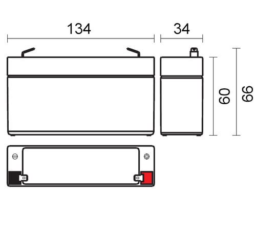 ** Caratteristiche Generali ** Adatto per: UPS Tecnologia: Piombo AGM ** Caratteristiche Elettriche ** Tensione: 6V Capacità: 3.4Ah ** Caratteristiche Meccaniche ** Dimensioni: 34mm x 134mm x 66mm Peso: 0.65Kg Connessioni: faston 4.8mm