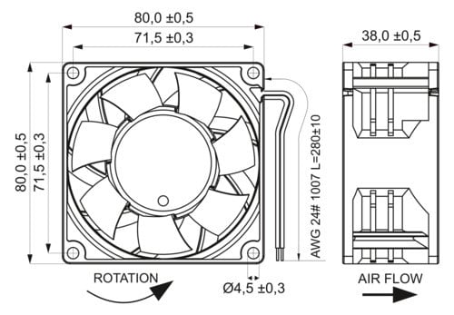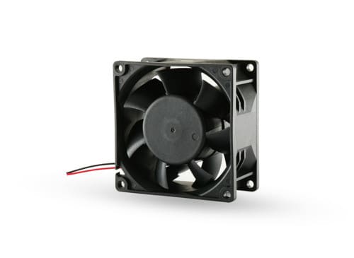 ** Caratteristiche Generali ** Velocità di rotazione: 7500RPM Flusso aria: 2.9, (102.4) Pressione statica: 32.5, (1.28) Rumorosità: 63.5dB Cuscinetti: A sfera Tipo ventola: Assiale Sensore di arresto: Si ** Caratteristiche Elettriche ** Tipo tensione: DC Corrente nominale: 1A Potenza: 24W ** Caratteristiche Meccaniche ** Dimensioni (LxWxH): 80 x 80 x 38mm Materiale girante: PBT Materiale contenitore: PBT Colore: Nero Conduttori: 2 fili Connessioni: cavi liberi ** Caratteristiche Termiche ** Grado di infiammabilità: 94V-0 Temperatura di lavoro: -25/70°C Temperatura di stoccaggio: -40/75°C