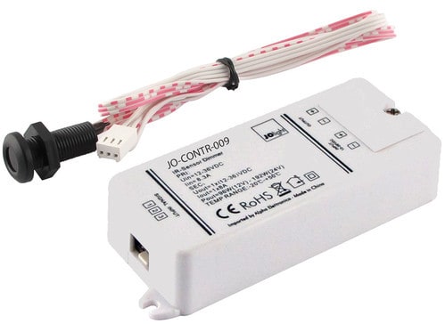 ** Caratteristiche ** Interruttore con sensore infrarosso IR attraverso il quale è possibile controllare l'accensione automatica di nastri led, lampade e faretti funzionanti a tensione costante(12, 24 oppure 36Vdc). ** Funzionamento: ** Il controller spegne l'uscita quando rileva la presenza di oggetti riflettenti i raggi infrarossi di fronte al sensore IR stesso. Il dispositivo può essere utilizzato come controller per luce di cortesia in armadi e altri mobili con ante. Se montato internamente a un mobile: aprendo l'anta l'uscita si accende chiudendo l'anta l'uscita si spegne ** Sensore ** Distanza di lavoro: max 6cm circa Angolo di lavoro: 15° Foro di montaggio sensore: 10mm Sensibilità: non modificabile ** Esempio d'installazione ** Anta dell'armadio chiusa -> luce spenta; Anta dell'armadio aperta -> luce accesa; ** Caratteristiche Generali ** Funzione: Controller Adatto per: Monocolore Metodo di controllo: Sensore IR ** Caratteristiche Elettriche ** Tipo regolazione: Tensione costante (CV) Tensione d'ingresso: 12/24/36V Tensione d'uscita: come ingresso Tipo di uscita: morsetti Corrente/Ch: 8A n. canali: 1 Potenza nominale (12V): 96W Potenza nominale (24V): 192W ** Caratteristiche Meccaniche ** Lunghezza: 82mm Larghezza: 33mm Altezza: 20mm Grado di protezione: IP20 Materiale corpo: Plastica Colore corpo: Bianco ** Caratteristiche Termiche ** Temp. di funzionamento: -10 / 40°C ** Note ** - Il sensore NON è in grado di lavorare attraverso una superficie in vetro, plastica o plexiglass. - Non allungare o modificare il cavo del sensore. Ogni modifica al cablaggio del sensore invalida la garanzia. - L'alimentatore dovrà essere scelto in funzione del tipo di carico led utilizzato per tensione e corrente. - Utilizzare un alimentatore con potenza nominale maggiore rispetto al carico led da alimentare (circa 30%).