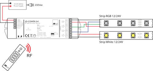 Telecomando per controllo colore di strisce LED RGBW. Il telecomando JO-CONTR-235, utilizzato con gli appositi ricevitori di Alpha Elettronica opportunamente connessi ad una striscia led RGBW oppure una striscia led RGB ed una bianca, consente tramite rotella la miscelazione dei vari colori RGB e del bianco. Inoltre è possibile regolare l’intensità (dimmer) della colorazione scelta tramite i tasti funzione. È possibile selezionare fino a dieci modalità dinamiche di rotazioni di colore RGB e modificarne la velocità di transizione. ** Caratteristiche ** - Il telecomando è in grado di gestire fino a quattro zone (tasti 1,2,3,4). - Ogni zona deve essere composta da almeno un ricevitore ** (non incluso) ** - Ad ogni ricevitore può essere collegato una striscia RGBW oppure una striscia RGB e una striscia Bianca - Per ogni zona possono essere salvati fino a tre stati dinamici oppure fissi (memoria). ** Caratteristiche Tecniche Telecomando ** Frequenza: 868MHz Batterie: 3 x AAA (1,5V) Raggio d'azione: 30m Funzioni: Regolazione RGBW e dimmer Zone: 4 (salvataggio di 3 impostazioni per ogni zona) ** Caratteristiche Generali ** Funzione: Telecomando Adatto per: RGBW Metodo di controllo: RF ** Caratteristiche Meccaniche ** Lunghezza: 120mm Larghezza: 55mm Altezza: 17mm Grado di protezione: IP20 Materiale corpo: Plastica Colore corpo: Nero ** Note ** Il telecomando deve essere utilizzato in abbinamento con almeno un ricevitore apposito di Alpha Elettronica ** (non incluso) ** . Un telecomando JO-CONTR-235 può lavorare con tanti ricevitori (fino a 100 a patto che tutti i dispositivi coinvolti siano all’interno del raggio di 30m). Un ricevitore può lavorare con più telecomandi (fino a 6). Al momento dell'installazione i telecomandi devono essere associati ai relativi ricevitori tramite il tasto “Learning key” presente sul ricevitore.