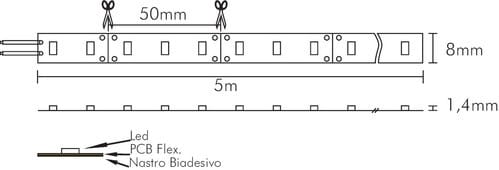** Caratteristiche Generali ** Applicazione: Per illuminazione Tempo di vita L70B50: 20000h Numero cicli di accensione: 10000 cicli Fattore di sopravvivenza: 1 Tipo nastro: Monocolore Colore Supporto: Bianco Tipo di led: smd 3528 n. Led al metro: 60 led/m Lunghezza max in cascata: 5m Rischio fotobiologico: Esente ** Caratteristiche di Illuminazione ** Colore: Bianco freddo Flusso Nastro Led: 500lm/m Flusso @ 50cm: 250lm CRI: 90 Angolo di emissione: 120° Warm-up (60%): 0.1s Fattore mantenimento flusso: 0.97 Uniformità colore (SDCM): 6 ** Caratteristiche Elettriche ** Classe energetica: F Potenza Nastro Led: 4.8W/m Potenza 50cm: 2.4W Potenza unità minima: 0.24W Tens. funzionamento DC: 12Vdc Dimmerabile: si Alimentatore: Esterno (non incluso) ** Caratteristiche Sorgente Luminosa ** Temp. Colore: 6500K ** Caratteristiche Meccaniche ** Lunghezza nastro: 5m N. Led/taglio: 3 Lunghezza taglio minima: 50mm Larghezza: 8mm Spessore: 1.4mm Altezza: 2mm Fissaggio: Biadesivo 3M Grado di protezione: IP20 Tipo di protezione: Nessuno Connessioni: Cavo libero ** Caratteristiche Termiche ** Temp. di funzionamento: -10 / 40°C