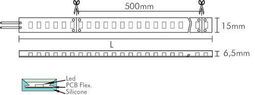 ** Caratteristiche Generali ** Applicazione: Per illuminazione Tempo di vita L70B50: 20000h Numero cicli di accensione: 10000 cicli Fattore di sopravvivenza: 0.9 Tipo nastro: Monocolore Colore Supporto: Bianco Tipo di led: smd 3528 n. Led al metro: 120 led/m Lunghezza max in cascata: 50m Rischio fotobiologico: Esente ** Caratteristiche di Illuminazione ** Colore: Bianco freddo Flusso Nastro Led: 490lm/m Flusso @ 50cm: 245lm CRI: 94 Angolo di emissione: 110° Warm-up (60%): 0.1s Fattore mantenimento flusso: 0.96 Uniformità colore (SDCM): 6 ** Caratteristiche Elettriche ** Classe energetica: G Potenza Nastro Led: 8W/m Potenza 50cm: 4W Potenza unità minima: 4W Fattore di potenza PF: 0.9 Fattore di sfasamento DF: 0.9 Tens. funzionamento AC: 230Vac Tolleranza d'ingresso: ±10% Frequenza: 50Hz Dimmerabile: no ** Caratteristiche Sorgente Luminosa ** Temp. Colore: 6000K ** Caratteristiche Meccaniche ** Lunghezza nastro: 5m N. Led/taglio: 60 Lunghezza taglio minima: 500mm Larghezza: 15mm Spessore: 6.5mm Altezza: 6mm Grado di protezione: IP65 Resistenza agli urti: IK08 Tipo di protezione: Tubo siliconico Connessioni: Cavo libero ** Caratteristiche Termiche ** Temp. di funzionamento: -10 / 40°C La striscia deve essere collegata direttamente alla rete 230V 50Hz. Proteggere l'ingresso tramite fusibile. Si raccomanda l’installazione in posizione inaccessibile a persone o animali. Accessori inclusi: 2 Clip/m