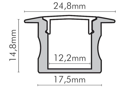 ** Caratteristiche generali ** Kit composto da: -n. 1 profilo di alluminio da 2m, -n. 1 copertura da 2m -n. 2 terminali di chiusura in plastica -n. 4 graffette di fissaggio ** Caratteristiche Elettriche ** Potenza dissipabile (35°C): 19W/m ** Caratteristiche Meccaniche ** Lunghezza profilo: 2m Larghezza: 25mm Larghezza interna: 12.2mm Altezza: 15mm Peso alluminio al metro: 185g/m Peso cover al metro: 32g/m Materiale corpo: Alluminio anodizzato Colore corpo: Naturale Diffusore: Policarbonato opaco ** Attenzione ** La copertura in Policarbonato (PC) è più sensibile alle temperature e ai raggi UV rispetto alla copertura in PMMA. Il profilo illustrato è un componente. Il suo corretto funzionamento con nastri led o moduli led dipende da importanti requisiti di installazione e dimensionamento. La potenza dissipabile è stata calcolata considerando una temperatura ambiente non superiore a 35°C in aria. Condizioni di installazione differenti devono essere opportunamente verificate da personale tecnico. Utilizzare la copertura solo con nastri led IP20. Alpha Elettronica declina ogni responsabilità per danni o malfunzionamenti derivati da un uso inappropriato del profilo.