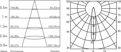 ** Caratteristiche Generali ** Tempo di vita L70B50: 30000h Numero cicli di accensione: 15000 cicli Numero Led: 1 Rischio fotobiologico: Esente ** Caratteristiche di Illuminazione ** Colore: Giallo Flusso: 50lm CRI: 80 Angolo di emissione: 25° ** Caratteristiche Elettriche ** Potenza: 3W Tens. funzionamento DC: 24Vdc ** Caratteristiche Meccaniche ** Grado di protezione: IP67 Materiale corpo: Alluminio anodizzato Connessioni: Cavo libero Lunghezza cavo: 12m ** Caratteristiche Termiche ** Temp. di funzionamento: -20 / 40°C