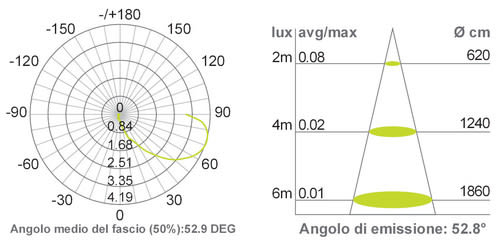 ** Caratteristiche Generali ** Tempo di vita L70B50: 30000h Numero cicli di accensione: 15000 cicli Numero Led: 1 Rischio fotobiologico: Esente ** Caratteristiche di Illuminazione ** Colore: Bianco freddo Flusso: 20lm CRI: 80 Angolo di emissione: 50° ** Caratteristiche Elettriche ** Potenza: 2.5W Tens. funzionamento DC: 24Vdc Dimmerabile: no Alimentatore: Esterno (non incluso) ** Caratteristiche Sorgente Luminosa ** Temp. Colore: 5700K ** Caratteristiche Meccaniche ** Altezza: 76mm Diametro: ø55mm Fissaggio: Incasso con cassaforma inclusa Montaggio: A pavimento Foro incasso: ø44mm Grado di protezione: IP67 Materiale corpo: Alluminio verniciato Colore corpo: Grigio Cornice: Acciaio Diffusore: Vetro temprato Capacità di carico: ø10mm 1330Kg Connessioni: Cavo libero Tipologia cavo: H05RNF Lunghezza cavo: 0.5m ** Caratteristiche Termiche ** Temp. di funzionamento: -20 / 40°C Faretto con driver elettronico integrato con ingresso capacitivo. Utilizzare con alimentatore 3 volte la potenza nominale.