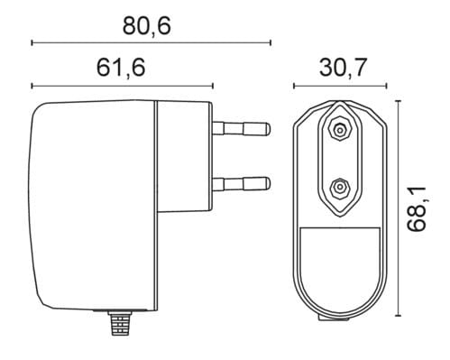 ** Caratteristiche Generali ** Tecnologia: switching Costruzione: plugin Tipo regolazione: CV Classe isolamento: II Grado Protezione: IP20 ** Caratteristiche Elettriche ** Tensione d'ingresso: 100‑240Vac Tolleranza d'ingresso: -10% +6% Frequenza: 50/60Hz Potenza: 12.5W Tensione d'uscita: 5V Corrente d'uscita: 2500mA Regolazione di carico: ±5% Regolazione di linea: ±5% Tolleranza tensione d'uscita: ±5% Ripple:
