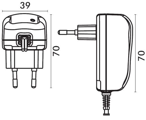 ** Caratteristiche Generali ** Tecnologia: switching Costruzione: plugin Tipo regolazione: CV Classe isolamento: II Grado Protezione: IP20 ** Caratteristiche Elettriche ** Regolazione uscita: commutatore manuale Tensione d'ingresso: 100‑240Vac Frequenza: 50/60Hz Potenza: 7.2W Corrente d'uscita: 600mA Tensione d'uscita: 3 - 12V Regolazione di carico: ±5% Regolazione di linea: ±5% Tolleranza tensione d'uscita: ±5% Protezioni: sovraccarico, sovratemperatura, corto circuito ** Caratteristiche Meccaniche ** Dimensioni (LxWxH): 70 x 39 x 70mm Raffreddamento: passivo Materiale contenitore: Plastico Colore: Nero Connessioni: connettore intercambiabile Cavo d'uscita: integrato 1m Connettori: 5,5x2,1mm, 5,5x2,5mm, 4,0x1,7mm, 3,5mm, 3,5x1,35mm, 2,35x0,7mm Polarità: invertibile ** Caratteristiche Termiche ** Temperatura di lavoro: -10/30°C