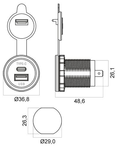 ** Caratteristiche Generali ** Tecnologia: dc-dc switching non isolato Grado Protezione: IP50 ** Caratteristiche Elettriche ** Tensione d'ingresso: 12‑28Vdc Potenza: 15W Tensione d'uscita: 5V Corrente d'uscita: 3000mA Tolleranza tensione d'uscita: ±5% Protezioni: corto circuito ** Caratteristiche Meccaniche ** Dimensioni (LxWxH): 36.8 x 36.8 x 48.6mm Materiale contenitore: Plastico Colore: Nero Connessioni: faston 6,3 Connettori: USB tipo"A", USB tipo"C" ** Caratteristiche Termiche ** Temperatura di lavoro: 0/40°C