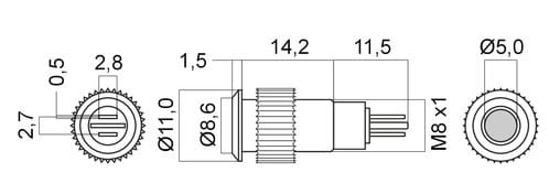 ** Caratteristiche Generali ** Tempo di vita L70B50: 50000h Tipo di led: 5mm ** Caratteristiche di Illuminazione ** Colore: Rosso ** Caratteristiche Elettriche ** Corrente ingresso max: 15mA Tens. funzionamento DC: 24Vdc ** Caratteristiche Meccaniche ** Numero di pin: 2 Lunghezza: 27.2mm Diametro: ø11mm Montaggio: a pannello Foro incasso: ø8mm Grado di protezione: IP65 Materiale corpo: Ottone nichelato Colore corpo: Lucido Connessioni: a saldare ** Caratteristiche Termiche ** Temp. di funzionamento: -10 / 40°C