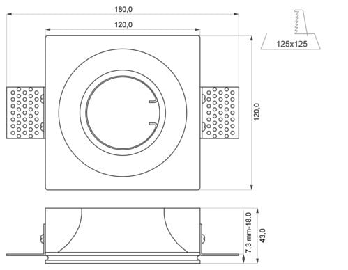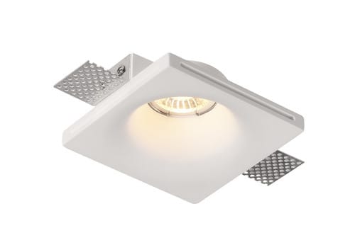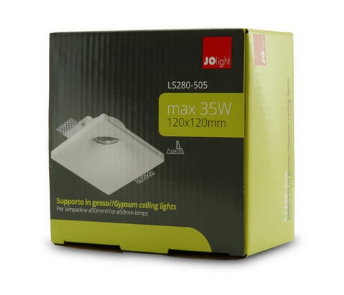 ** Caratteristiche Elettriche ** Potenza max installabile: 35W ** Caratteristiche Meccaniche ** Lunghezza: 120mm Larghezza: 120mm Altezza: 45mm Foro incasso: 125 x 125mm Grado di protezione: IP20 Materiale corpo: Gesso Colore corpo: Bianco Finitura: Opaca Diffusore: Nessuno Orientabile: no Portafaretto da incasso in gesso a scomparsa per lampade PAR16 con attacco GU10 oppure MR16 con attacco GU5,3. Adatto per lastre di carton gesso con spessore 12,5mm o superiore. Nella confezione sono inclusi le alette e la molla per il fissaggio del faretto. Non inclusi nella confezione: Lampadina e portalampada Cover in vetro non prevista. Utilizzare esclusivamente i portalampade indicati: GU10 (230V): 23-9-104/3 GU5.3 (12V): 23-9-106/3