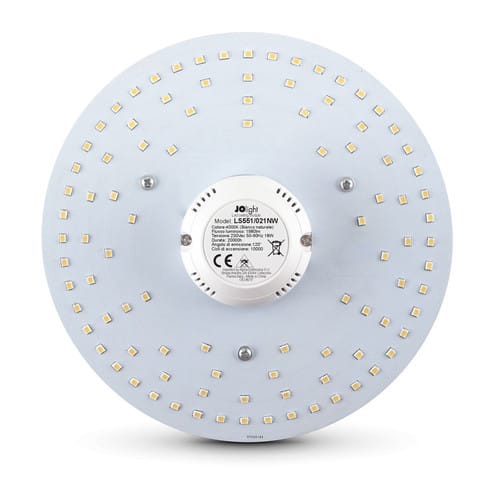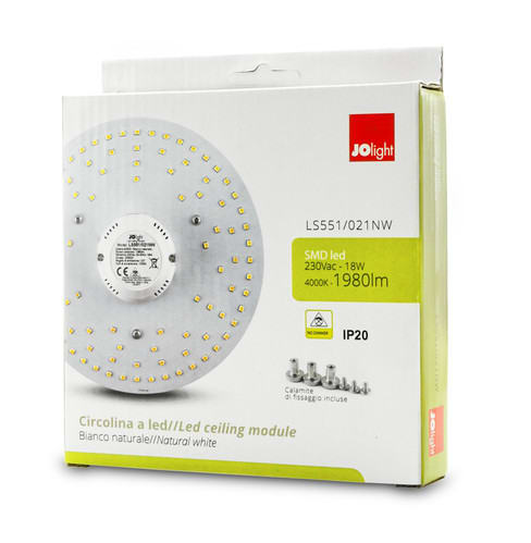 Circolina led con alimentatore incluso. ** Caratteristiche Generali ** Tempo di vita L70B50: 20000h Numero cicli di accensione: 10000 cicli Fattore di sopravvivenza: 0.9 Tipo di led: smd 2835 Numero Led: 80 Rischio fotobiologico: Esente ** Caratteristiche di Illuminazione ** Colore: Bianco naturale Flusso: 1850lm CRI: 80 Angolo di emissione: 120° Warm-up (60%): 0.2s Fattore mantenimento flusso: 0.96 Uniformità colore (SDCM): 6 ** Caratteristiche Elettriche ** Classe energetica: F Potenza: 18W Fattore di potenza PF: 0.55 Fattore di sfasamento DF: 0.7 Tens. funzionamento AC: 230Vac Tolleranza d'ingresso: ±10% Frequenza: 50-60Hz Dimmerabile: no Classe isolamento: II Alimentatore: Esterno (incluso) ** Caratteristiche Sorgente Luminosa ** Temp. Colore: 4000K ** Caratteristiche Meccaniche ** Attacco: Cavetto Lunghezza: 150mm Larghezza: 150mm Altezza: 22mm Diametro: ø150mm Grado di protezione: IP20 Diffusore: Nessuno ** Caratteristiche Termiche ** Temp. di funzionamento: -10 / 40°C Contenuto Confezione -Modulo led - n3 calamite di fissaggio