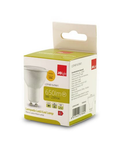 ** Caratteristiche Generali ** Tipo lampada: PAR16 Tempo di vita L70B50: 15000h Numero cicli di accensione: 10000 cicli Fattore di sopravvivenza: 0.9 Rischio fotobiologico: Esente ** Caratteristiche di Illuminazione ** Colore: Bianco caldo Flusso: 650lm CRI: 80 Angolo di emissione: 105° Starting time: 0.2s Fattore mantenimento flusso: 0.96 Uniformità colore (SDCM): 6 ** Caratteristiche Elettriche ** Classe energetica: G Potenza: 9W Fattore di sfasamento DF: 0.7 Tens. funzionamento AC: 230Vac Tolleranzad'ingresso: ±10% Frequenza: 50-60Hz Dimmerabile: no ** Caratteristiche Sorgente Luminosa ** Temp. Colore: 3000K ** Caratteristiche Meccaniche ** Attacco: GU10 Lunghezza: 50mm Larghezza: 50mm Altezza: 56mm Diametro: ø50mm Colore corpo: Bianco Diffusore:Policarbonato lenticolare ** Caratteristiche Termiche ** Temp. di funzionamento: -10 / 40°C