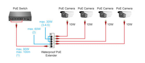 L'extender PoE è un dispositivo per estendere la distanza di trasmissione dell'alimentazione PoE e dei dati Ethernet tramite cavo LAN fino a 100m per dispositivi compatibili con questa tecnologia. Abilitando la funzione VLAN (Virtual Local Area Network) è possibile estendere la distanza da 100m a 250m (sulle porte 3-4-5). La tecnologia PoE assicura che l'alimentazione viene inviata solo ai dispositivi compatibili; i dispositivi non PoE ricevono solo i dati. Questo ripetitore non richiede alimentazione aggiuntiva, viene alimentato direttamente dall'ingresso PoE. Il design senza ventola lo rende ideale per un funzionamento affidabile e silenzioso. ** Connettività ** Tipologia: Fast Ethernet Tecnologia: Unmanaged Velocità porte LAN: 10/100Mbps Network media: 10/100/1000 BASE-TX Cavo UTP rame puro Cat.5e o superiore Dimensioni Tabella MAC: 1000 PoE Input: 44-57Vdc 90W (P5) PoE Output: 44-57Vdc 90W (P1-2-3 30W) (P4 60W MCU) Distanza trasmissione Input: 100 Distanza trasmissione Output: 100m (VLAN OFF), 250mP1-2-3 100m P4 (VLAN ON) Consumo stand-by: 1W Funzioni: Installazione Plug&Play, Modalità TVCC, PoE, Supporto VLAN Standard: IEEE 802.3, IEEE 802.3u, IEEE 802.3x Standard PoE : IEEE802.3AF/AT Potenza PoE totale max : 90W ** Numero porte ** Totale porte:5 ** Caratteristiche meccaniche ** Montaggio: Parete Materiale contenitore : Plastico Colore : Bianco Indicazioni Led: Alimentazione dispositivo, Stato di ciascuna porta Raffreddamento : Passivo Dimensioni: 35mm x 101mm x 152mm Grado di protezione: IP55 Peso: 160g ** Contenuto confezione ** - 1 x PoE Extender