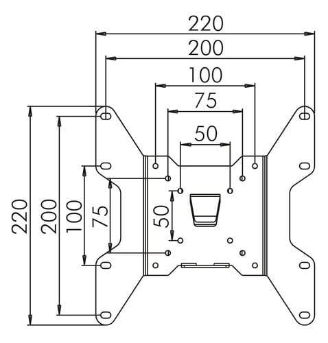 ** Caratteristiche Generali ** Funzionalità: Fisso Tipologia montaggio: Da parete Adatto per tv da: 13"- 37" Compatibilità VESA Max: 200x200mm Compatibilità VESA: 50x50, 75x75, 100x100, 200x100, 200x200 Estensione: Nessuna Rotazione (Pivot): 0° Inclinazione (Tilt): 0° Orientamento (Swivel): 0° Colore: Nero ** Caratteristiche Meccaniche ** Materiale: Acciaio Dimensioni (WxH): 220mm x 220mm Distanza dal muro: 1.2cm Distanza fori: 200x200mm Portata: 35Kg Peso prodotto: 0.7Kg Bolla di livello: No Sistema di bloccaggio: Si Gestione cavi: No Innesto a baionetta: No Kit di montaggio: Incluso