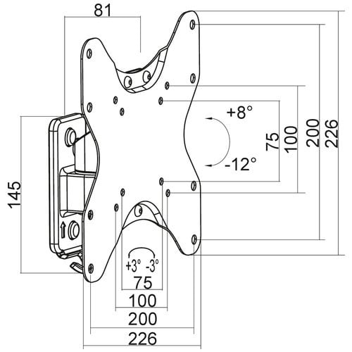 ** Caratteristiche Generali ** Funzionalità: Orientabile Tipologia montaggio: Da parete Adatto per tv da: 23"- 42" Compatibilità VESA Max: 200x200mm Compatibilità VESA: 75x75, 100x100, 200x100, 200x200 Estensione: Nessuna Rotazione (Pivot): -3° +3° Inclinazione (Tilt): -12° +8° Orientamento (Swivel): -30° +30° Colore: Nero ** Caratteristiche Meccaniche ** Avanzamento TV: Manuale Materiale: Acciaio Distanza dal muro: 8.1cm Portata: 20Kg Bolla di livello: No Sistema di bloccaggio: No Gestione cavi:Si Innesto a baionetta: No Kit di montaggio: Incluso