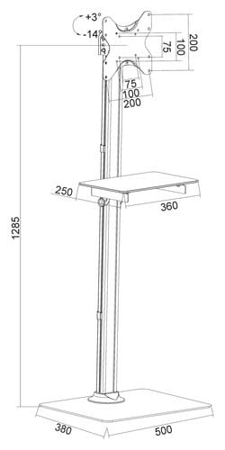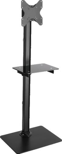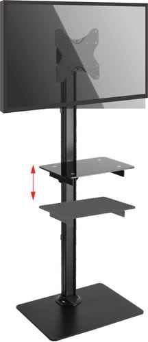 Supporto da pavimento con mensola in vetro adatta per appoggiare un dispositivo audio-video. Dimensioni piano di appoggio: 360x250mm. Portata 5kg. ** Caratteristiche Generali ** Tipologia montaggio: Da pavimento Adatto per tv da: 23"- 42" Compatibilità VESA Max: 200x200mm Compatibilità VESA: 75x75, 100x100, 200x100, 200x200 Rotazione (Pivot): -3° +3° Inclinazione (Tilt): -14° +3° Orientamento (Swivel): 0° Colore: Nero ** Caratteristiche Meccaniche ** Avanzamento TV: Manuale Materiale: Acciaio Portata: 25Kg Bolla di livello: No Sistema di bloccaggio: No Gestione cavi: Si Innesto a baionetta: No Kit di montaggio: Incluso