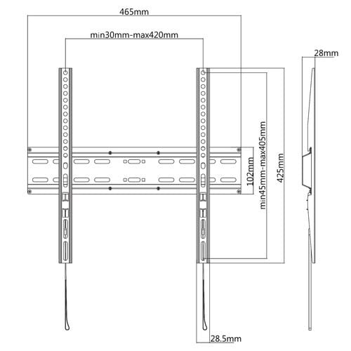 ** Caratteristiche Generali ** Funzionalità: Fisso Tipologia montaggio: Da parete Adatto per tv da: 32"- 55" Compatibilità VESA Max: 400x400mm Compatibilità VESA: 200x200, 300x200, 300x300, 400x200, 400x300, 400x400 Estensione: Nessuna Rotazione (Pivot): 0° Inclinazione (Tilt): 0° Orientamento (Swivel): 0° Colore: Nero ** Caratteristiche Meccaniche ** Materiale: Acciaio Dimensioni (WxH): 465mm x 425mm Distanza dal muro: 2.8cm Portata: 35Kg Bolla di livello: No Sistema di bloccaggio: No Gestione cavi: No Innesto a baionetta: No Kit di montaggio: Incluso