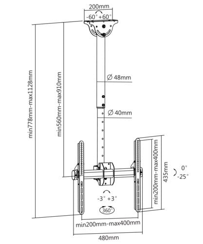 Installabile anche su soffitti inclinati: regolazione +60°-60°. Estensione da 560-910mm. ** Caratteristiche Generali ** Funzionalità: Orientabile Tipologia montaggio: Da soffitto Adatto per tv da: 32"- 55" Compatibilità VESA Max: 400x400mm Compatibilità VESA: 200x200, 300x200, 300x300, 400x200, 400x300, 400x400 Estensione: Braccio singolo Rotazione (Pivot): -3° +3° Inclinazione (Tilt): -25° +0° Orientamento (Swivel): -180° +180° Colore: Nero ** Caratteristiche Meccaniche ** Avanzamento TV: Manuale Materiale: Acciaio Distanza dal muro: 91cm Portata: 50Kg Bolla di livello: No Sistema di bloccaggio: No Gestione cavi: Si Innesto a baionetta: No Kit di montaggio: Incluso