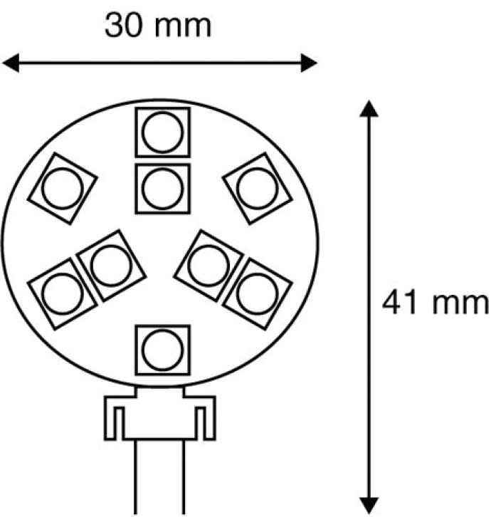 •Per la sostituzione delle lampadine alogene bispina.•12 LED ad alta luminosità SMD 5050.•Alimentazione: 12V c.a. - c.c. tramite trasformatore toroidale, o ferromagnetico, o alimentatore in corrente continua.•Attacco G4•Consumo: 2,4W•Dimensioni: 30 x 41 mm•Durata: 20.000 ore•Angolo di diffusione luminosa: 120°•IP20