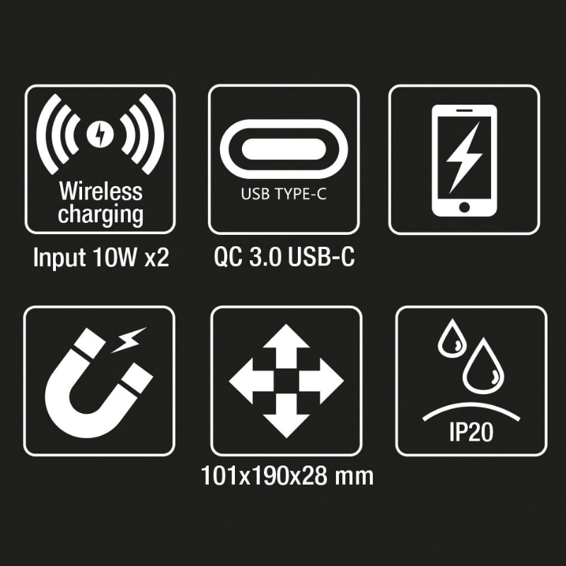 Caratteristiche: ? Due posizioni di ricarica con attacco magnetico utilizzabili contemporaneamente ? Con supporto estraibile per ricarica wireless telefono cellulare ? Led per indicare lo stato di ricarica ? Max input 10W x2 ? Input: AC 100-240V 50/60Hz ? Output: DC 12V 1.5A DC 9V 2A DC 5V 3A ? Cavo QC3.0 USB-C (Fast charger) ? Caricatore QC3.0 USB-C (Fast charger) ? Appendibile a parete tramite: 3 forti magneti sul retro 2 fori per viti ? IP20 ? IK07
