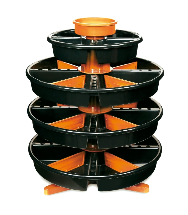 Caratteristiche: ? Dotato di un contenitore portaminuteria superiore (diametro 145 mm) e 4 vassoi girevoli: 1 diametro 305 mm 3 diametro 445 mm ? Fornito completo di 12 divisori applicabili all'interno dei 3 vassoi girevoli grandi per ottenere fino a 8 scompartimenti per piano ? 445x445x550 mm - ? 3,4 kg