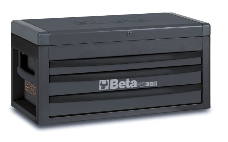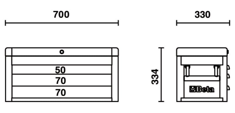 Cassettiera portautensili Beta con 3 cassetti da 588x277 mm, montati su guide telescopiche a sfera: ? 1 cassetto altezza 50 mm ? 2 cassetti altezza 70 mm Caratteristiche: ? Serratura centralizzata frontale ? Maniglie laterali a scomparsa per il trasporto