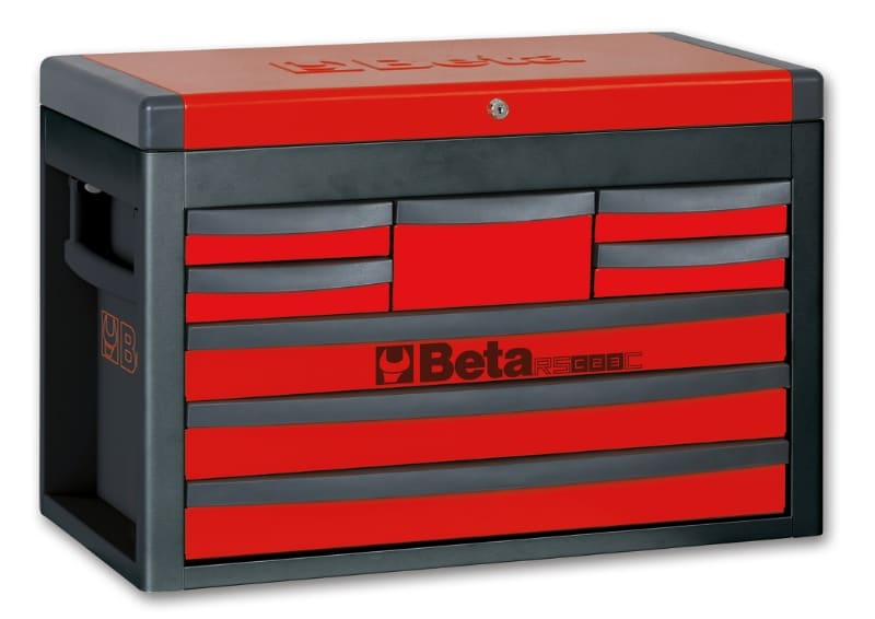 Cassettiera portautensili Beta con 8 cassetti da 588x277 mm, montati su guide telescopiche a sfera: ? 4 cassetti altezza 50 mm ? 3 cassetti altezza 70 mm ? 1 cassetto altezza 100 mm Caratteristiche: ? Serratura centralizzata frontale ? Maniglie laterali a scomparsa per trasportarla facilmente